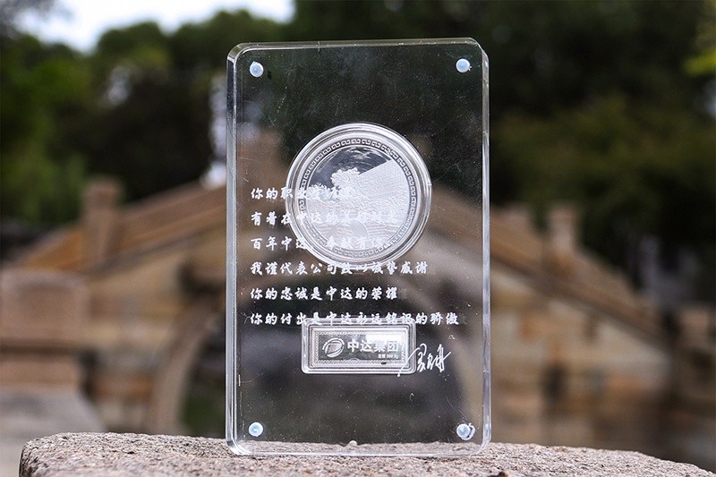 活動(dòng)的最后,集團(tuán)為每一位到場的老員工頒發(fā)了純銀紀(jì)念章,并與金董合影留念。這塊紀(jì)念章的正面印有中達(dá)集團(tuán)LOGO、退休員工姓名,背面印有中達(dá)集團(tuán)辦公區(qū)的兼善橋?!案F者獨(dú)善其身,達(dá)者兼善天下”是中達(dá)所崇慕之“達(dá)道”的含義,中達(dá)的企業(yè)發(fā)展,便是為了回報(bào)社會(huì),去善待員工、善待客戶、兼善社會(huì)。