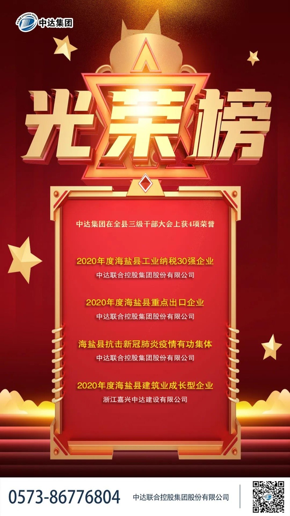喜訊 | 中達集團在全縣三級干部大會上獲4項榮譽 2021-02-20 16:00:00 中達聯(lián)合控股集團股份有限公司 瀏覽次數(shù) 3336 今天上午,海鹽縣召開全縣三級干部大會,會議通報了2020年度海鹽縣鎮(zhèn)(街道)、縣級部門(單位)目標(biāo)責(zé)任制考核結(jié)果、縣委縣政府中心工作先進集體和個人等。會上,中達集團獲得4項榮譽: 上一條開工大吉 | 牛年奮蹄加油干 下一條美麗工廠+ | 中達集團召開2021干部員工代表大會
