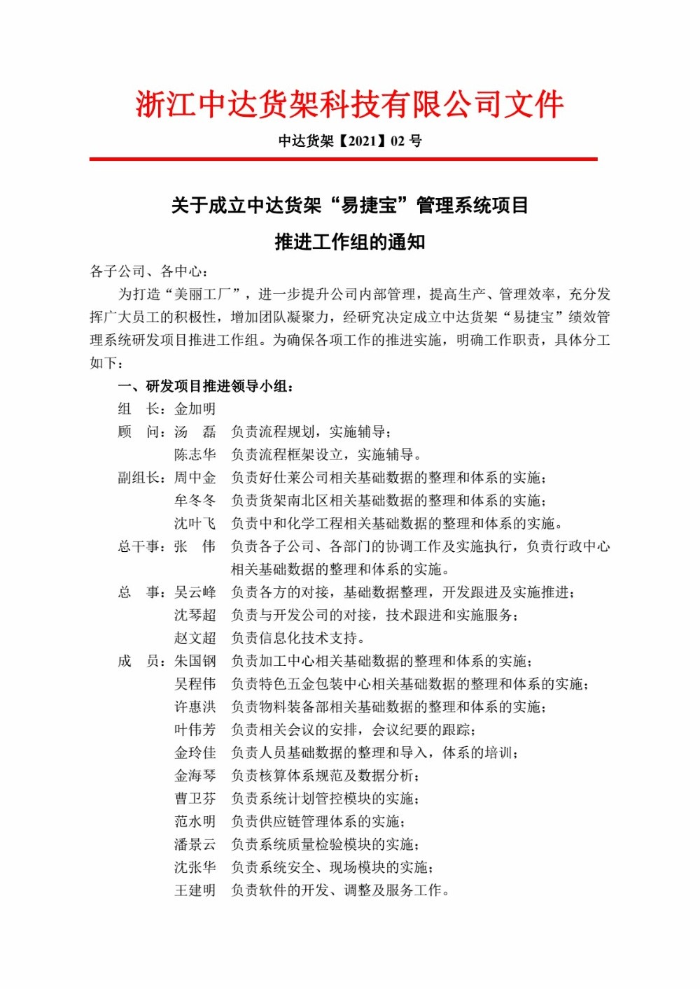 2021年1月28日,中達貨架“易捷寶”管理系統(tǒng)項目正式啟動,公司組建了推進小組,明確了組員職責(zé),制定了管理制度,標(biāo)志著中達貨架管理體系建設(shè)正式開始。