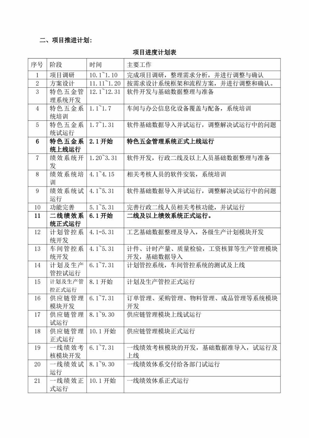 第一階段:二線及管理層績效考核系統(tǒng) 2021年一季度完成開發(fā),4、5月份測試,6月份正式。第二階段:計劃管控、車間管控系統(tǒng) 2021年5月份完成開發(fā),6、7月份測試,8月份上線。第三階段:供應(yīng)鏈管理控系統(tǒng) 2021年7月份完成開發(fā),8、9月份測試,10月份上線。第四階段:一線績效考核系統(tǒng)2021年7月份完成開發(fā),8、9月份測試,10月份正式上線。