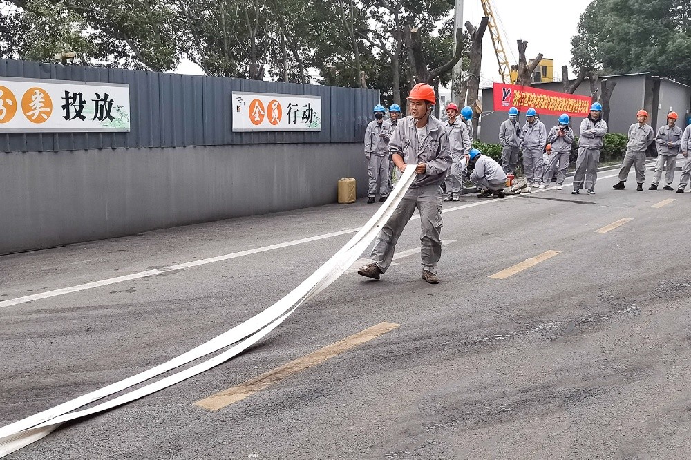 參加此次消防演練比武的共有四個團隊,項目共兩項。首先進行的是2人組60米滅火,此項演練主要用于初起火災的滅火撲救,它對固體火災及帶電類火災有良好的撲救效果。其次進行的是2人組兩盤水帶連接出水,用于距離較長、突發(fā)兇猛火災的滅火撲救,它由水龍帶展開、水槍連接等動作組成。在整個消防演練比武過程中,每位員工情緒飽滿、積極參與,為抑制火苗囂張的氣焰,有序順利地完成了一項又一項滅火任務。