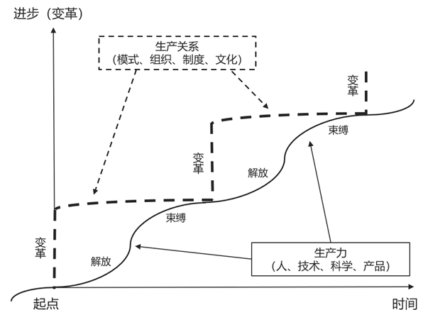 生產(chǎn)力是推動社會發(fā)展的主要動力,持續(xù)不斷的發(fā)展,直到生產(chǎn)關(guān)系開始束縛生產(chǎn)力的發(fā)展,使其進步緩慢。但生產(chǎn)力的發(fā)展是不可阻擋的,所以終將突破枷鎖,也就是說,生產(chǎn)關(guān)系將發(fā)生一次變革,建立一種不束縛生產(chǎn)力發(fā)展的關(guān)系。每次一次變革后,生產(chǎn)力會得到解放,逐步恢復(fù)發(fā)展速度,直到下一次束縛的到來。