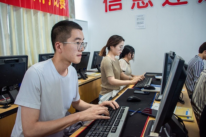 比賽現(xiàn)場(chǎng),每一位參賽選手都全神貫注、奮力打字,噼里啪啦的敲擊聲在安靜的教室中格外清晰,一個(gè)個(gè)漢字像跳動(dòng)的音符躍然屏幕,向著最高紀(jì)錄發(fā)起沖擊。