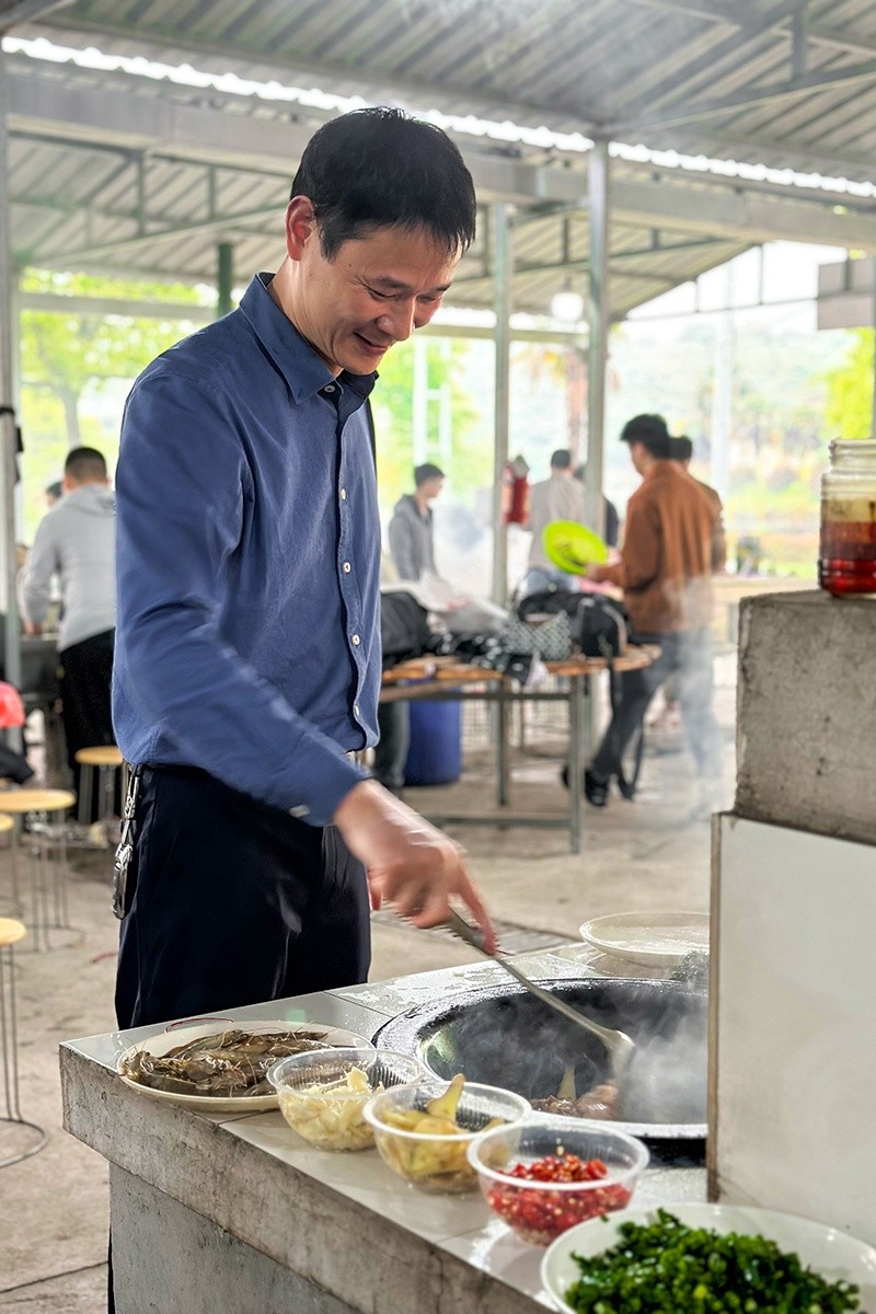 中午,大家按需求和個(gè)人所長(zhǎng)分工合作,前期準(zhǔn)備、中間烹調(diào)、后期衛(wèi)生保潔都有條不紊,事務(wù)瑣碎、工程浩大的土灶燒野米飯極富樂趣。伴隨著柴火燃燒的噼里啪啦聲,大廚們展示出不同的料理方式和技藝,土灶成為閃亮的表演舞臺(tái)。濃濃的香味刺激著味蕾,大家吃著野米飯、喝著飲料,你一言、我一語地聊著工作和生活中遇到的各種趣事,其樂融融。