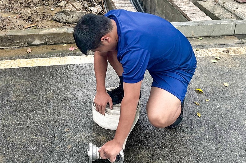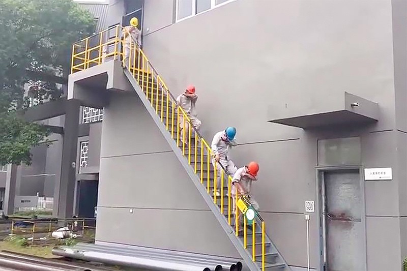 在整個疏散過程中,員工們不擁擠、不慌張,有序到達指定地點。此外還模擬1#電吊處著火的情景,讓每個到場的員工都進行一次消防帶的連接和滅火操作。