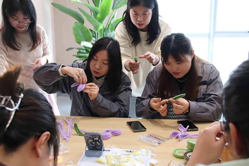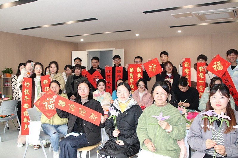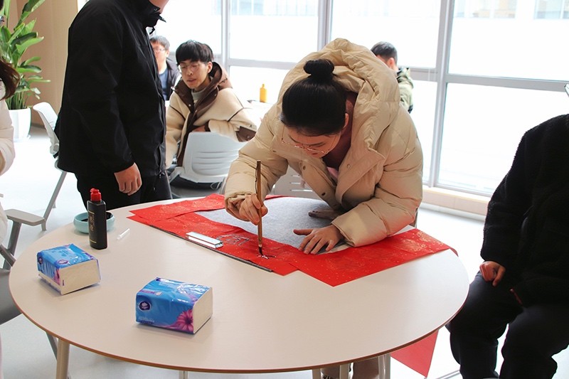 在“玩”的環(huán)節(jié),大家學(xué)習(xí)了絨花國(guó)風(fēng)發(fā)簪的制作,三位老師向員工們?cè)敿?xì)講解絨花的制作過程,包括所用工具、材料及其用途等。絨花作為中國(guó)傳統(tǒng)的手工藝品之一,有著悠久的歷史,是中國(guó)非物質(zhì)文化遺產(chǎn)寶庫(kù)中的組成部分。員工們爭(zhēng)相體驗(yàn),一根根絨花棒在大家手中變成了一朵朵活靈活現(xiàn)的花,讓大家親身體驗(yàn)到了傳統(tǒng)文化的魅力。隨后,大家還學(xué)習(xí)了紙漿畫的制作,它以紙漿為主要材料,顏色鮮艷,具有浮雕效果?;顒?dòng)將冬季的六個(gè)節(jié)氣通過紙漿畫的形式呈現(xiàn)出來(lái),大家小心翼翼地用竹簽和鑷子為各自的圖案上色,“立冬”“小雪”“大雪”“冬至”“小寒”“大寒”,一幅幅生動(dòng)立體的冬季節(jié)氣紙漿畫作品呈現(xiàn)在大家眼前。此外,更有幾位對(duì)書法感興趣的青年拿起了毛筆躍躍欲試,將美好的祝福寫在春聯(lián)上。