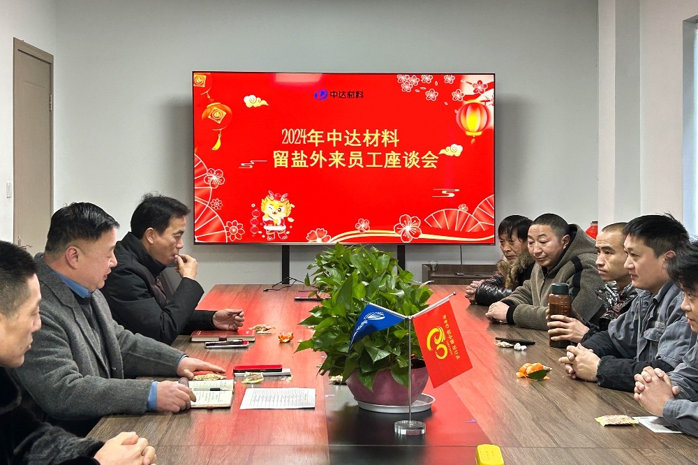 春節(jié)前,朱主席便來到中達(dá)材料參加了留鹽外來員工座談會(huì),調(diào)研了解公司的生產(chǎn)情況與留鹽外來員工的工作、生活狀況,感謝他們?yōu)橹羞_(dá)做出的貢獻(xiàn),向他們及其家人致以誠摯問候和佳節(jié)祝福,并送上了春節(jié)慰問品。朱主席叮囑中達(dá)材料工會(huì)要為留鹽外來員工提供便利,做好節(jié)日期間的防護(hù)措施,讓廣大留鹽外來員工感受到家的溫暖。